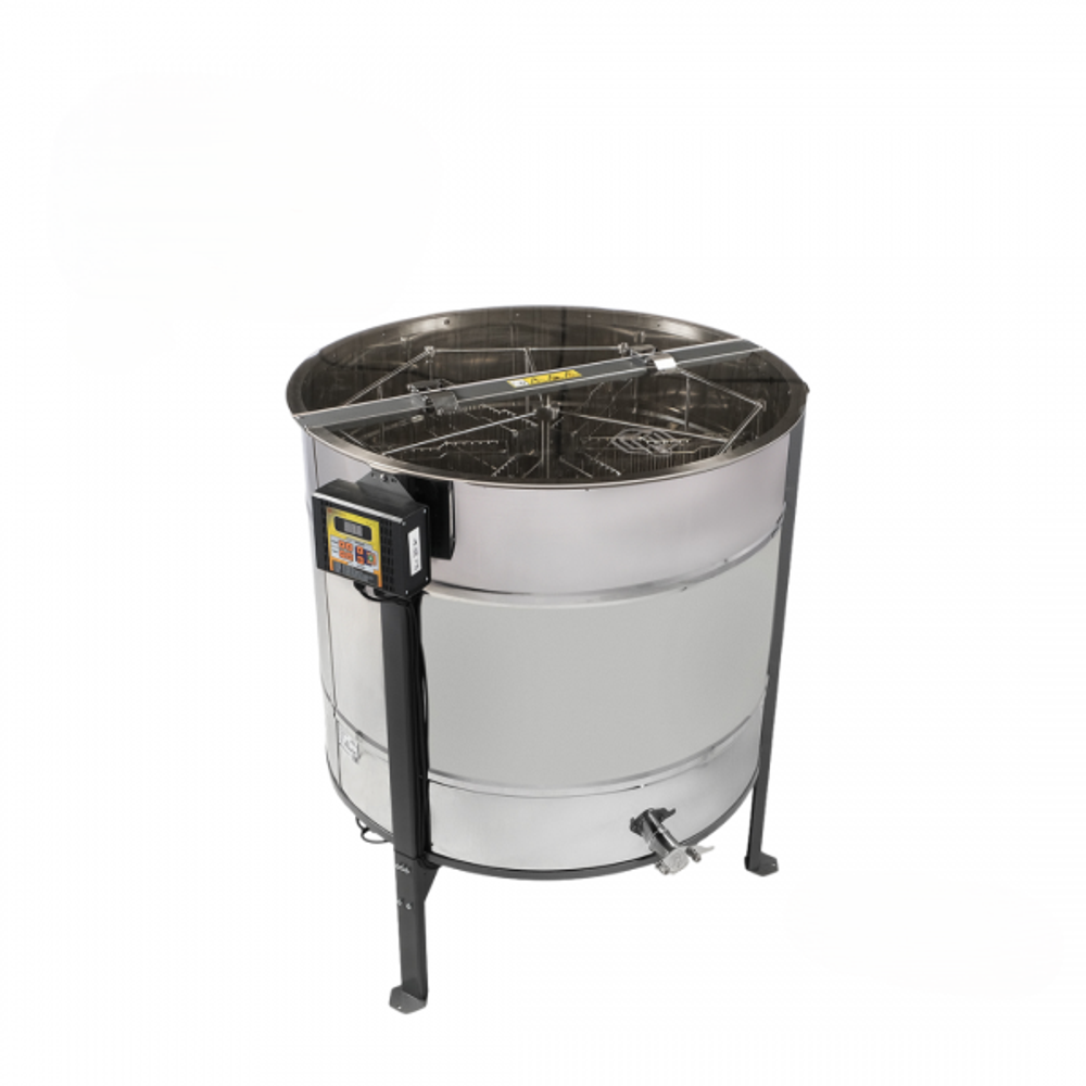 Автоматичната центрофуга е изцяло изработена от неръждаема стомана AISI 304 и е предназначена за бързо, ефективно и щадящо центрофугиране на 6 рамки Дадан или 12 магазинни с автоматично обръщане на касетите. Електрозадвижването 12/230V с двигател 300W осигурява мощна и плавна работа.