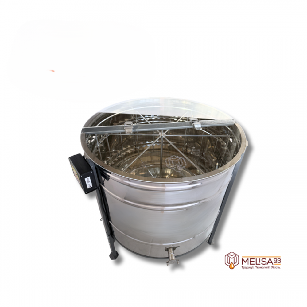 Радиална центрофуга Melisa93 AISI 304 за 54 магазинни / 54 Рут / 27 Дадан. Вал ø16 мм, дискове 3 мм, конусно дъно 0,8 мм, кран ø40 мм, плексиглас капак 4 мм с неръждаеми панти. Повратни касети по избор. Електрозадвижване 24/230V. Стойка включена.