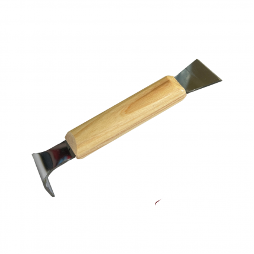 Универсален пчеларски инструмент за почистване на кошери от прополис и замърсявания, раздалечаване и повдигане на рамки, както и за разделяне на корпуси и магазинни надставки.